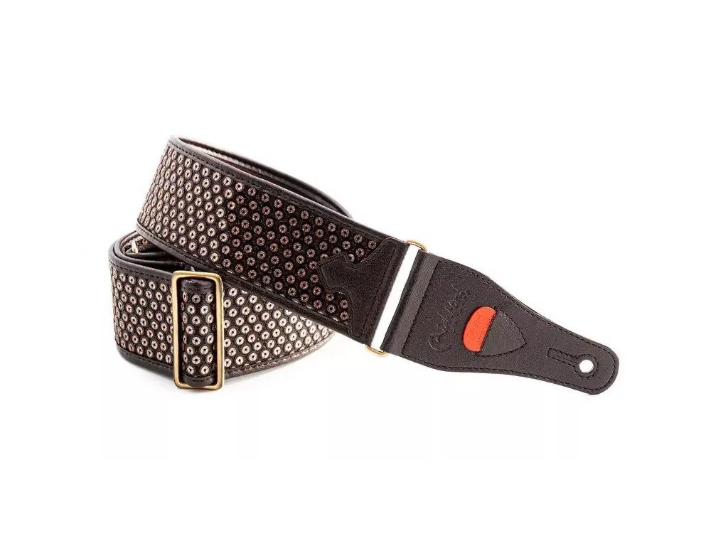 RightOn! kytarový řemen Disco Brown Vegan Guitar & Bass Strap je perfektní, stylový ale i funkční doplněk k většině akustických a elektrických kytar. Je vyroben speciální metodou umožňující vytvořit lesklý, zářící řemen příhodně pojmenovaný Disco a napodobující ony lesklé koule vysící nad parkety v sedmdesátých letech dvacátého století. Nabízí možnost nastavení délky v rozmezí 90 až 150 cm, je široký 6 cm, odolný a neuvěřitelně komfortní. Řemeny Talisman Strap jsou vyrobeny z materiálu 'Vegana', směsi syntetických, textilních a přírodních vláken a neobsahují žádné části zvířat. Je vybaven zásobníkem na trsátka. Výroba Španělsko. Kompletní ruční výroba. Provedení Disco Brown (hnědo-stříbrno-zlatá).